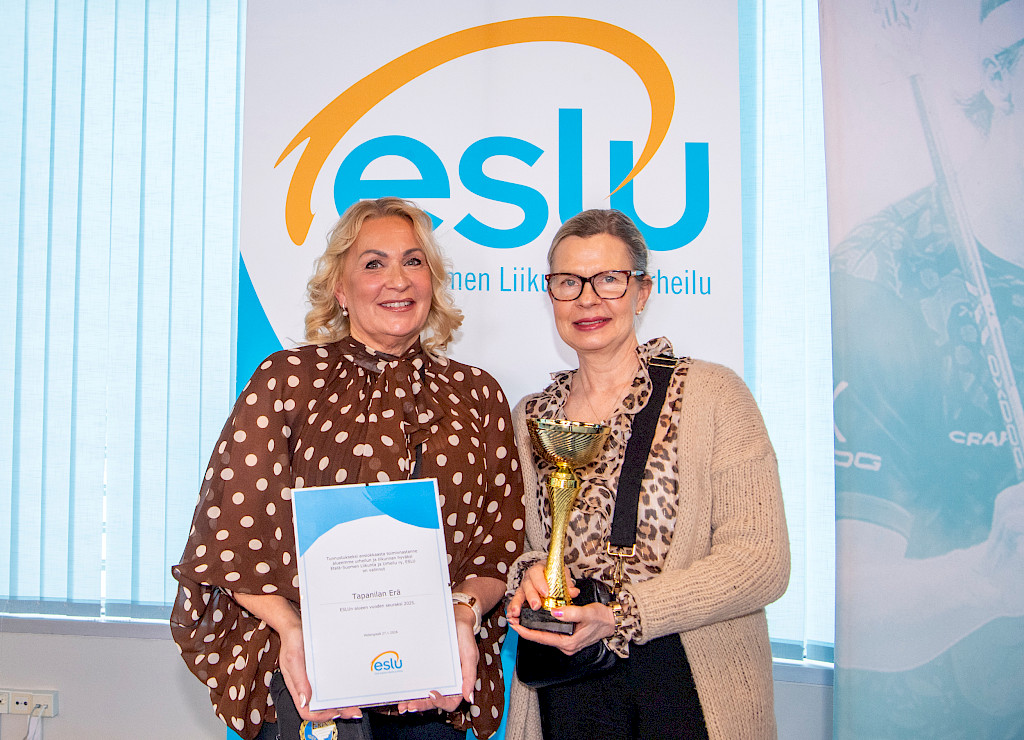 Kuvassa: ESLUn alueen vuoden seura 2025 -palkinnon vastaanottivat Tapanilan Erän toiminnanjohtaja Kirsi Johansson ja puheenjohtaja Satu Seppälä. Kuva: Kimmo Penttinen / EMG