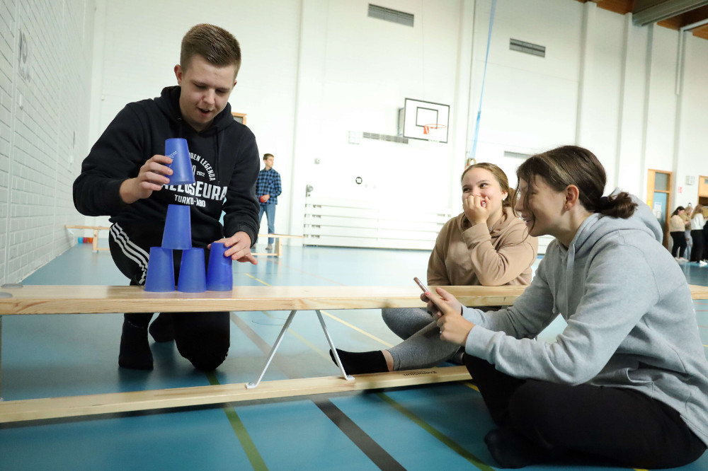 Heitto lähtee. ”Eiiii, ohi!” Kemiönsaaren lukion Johan Santalahti ja Anton Friman pelaavat keskittyneesti ”Bean bag tic tac toeta”. Ristinollan ja hernepussiheiton yhdistävä kisailu on vienyt pojat mennessään. ”Ollaan oltu aika tasaväkisiä. Tämä on kyllä yllättävän vaikeaa”, Sumeneeko ajatus? – Liike freesaa! -kehittämistoimintapäivään taukoliikuntaa kokeilemaan tulleet opiskelijat toteavat. Kuten monet salin 17 toimintapisteestä, peli aktivoi sekä aivoja että kroppaa.